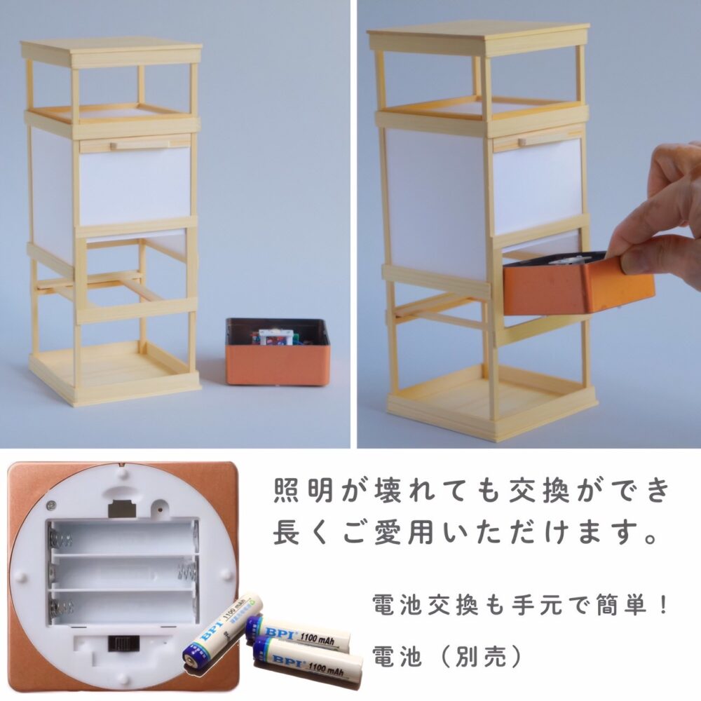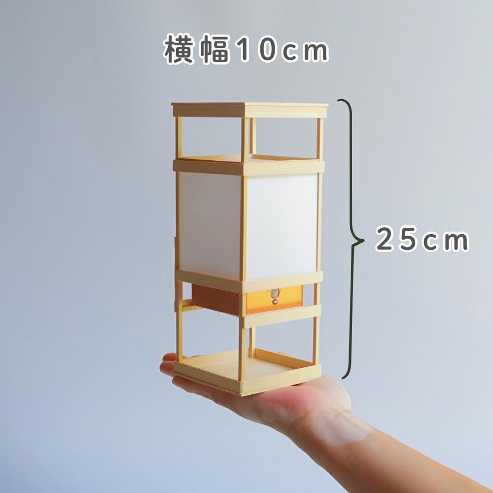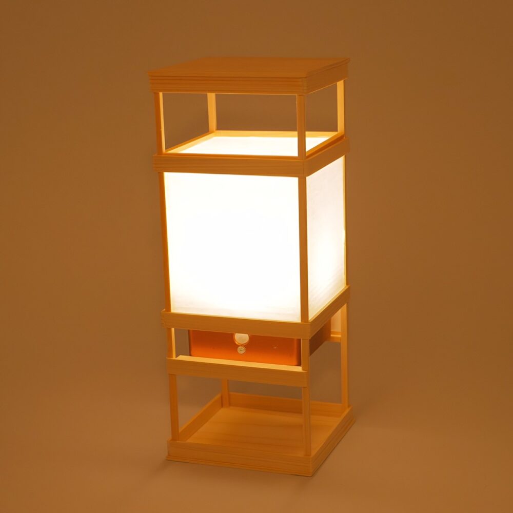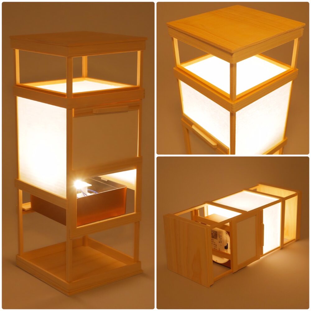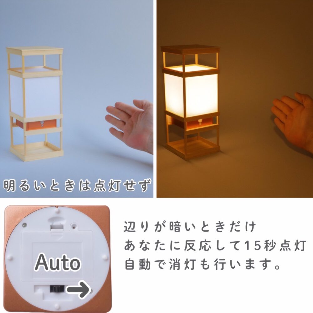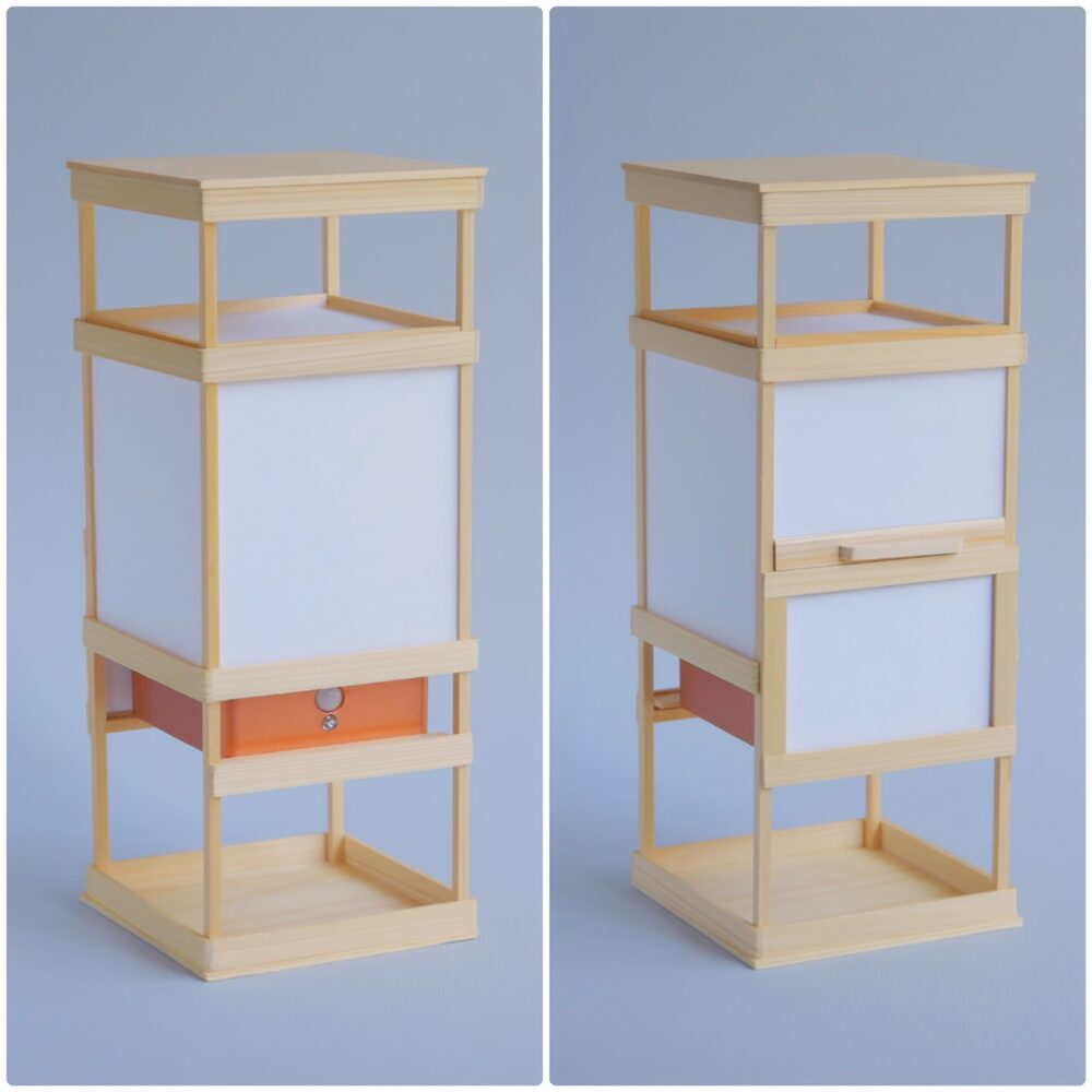人感明暗センサーを搭載したハンドメイド作品。25cmの棚置用の灯り箱。