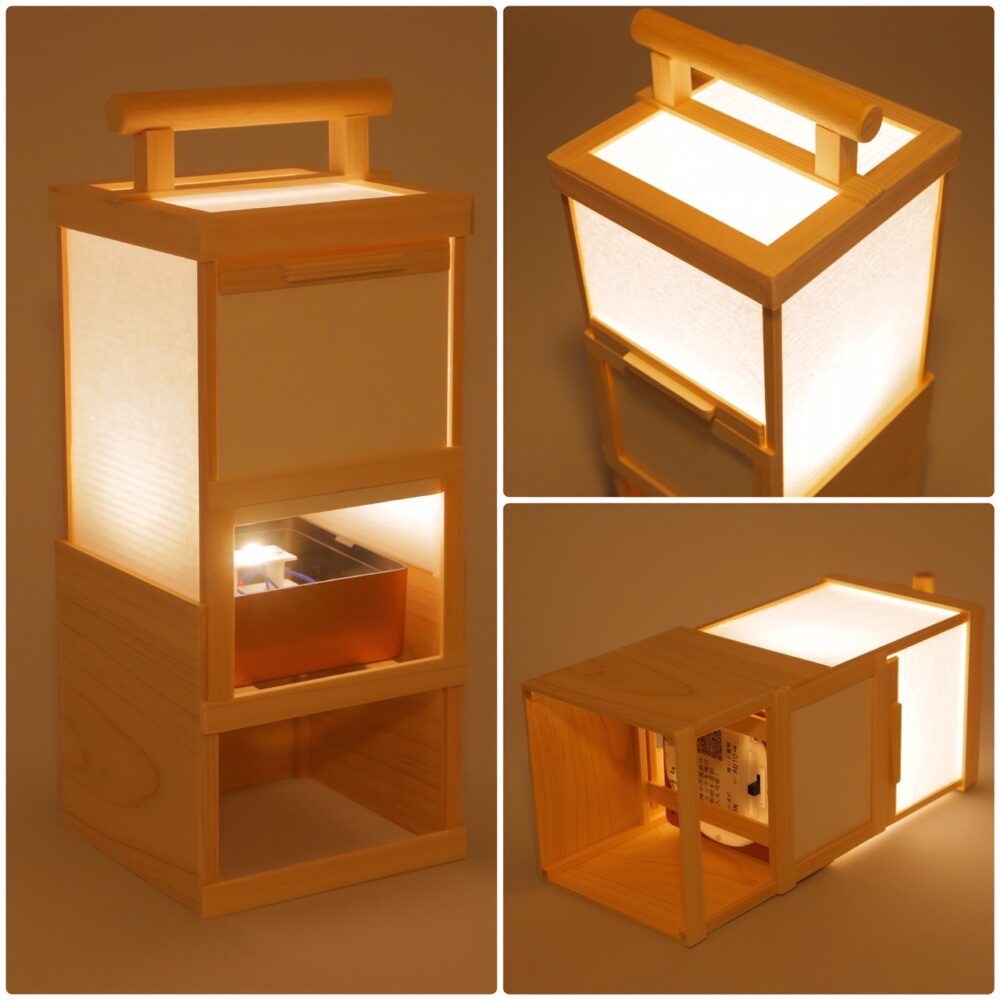 人感明暗センサーを搭載したハンドメイド作品。25cmの棚置用の灯り箱。