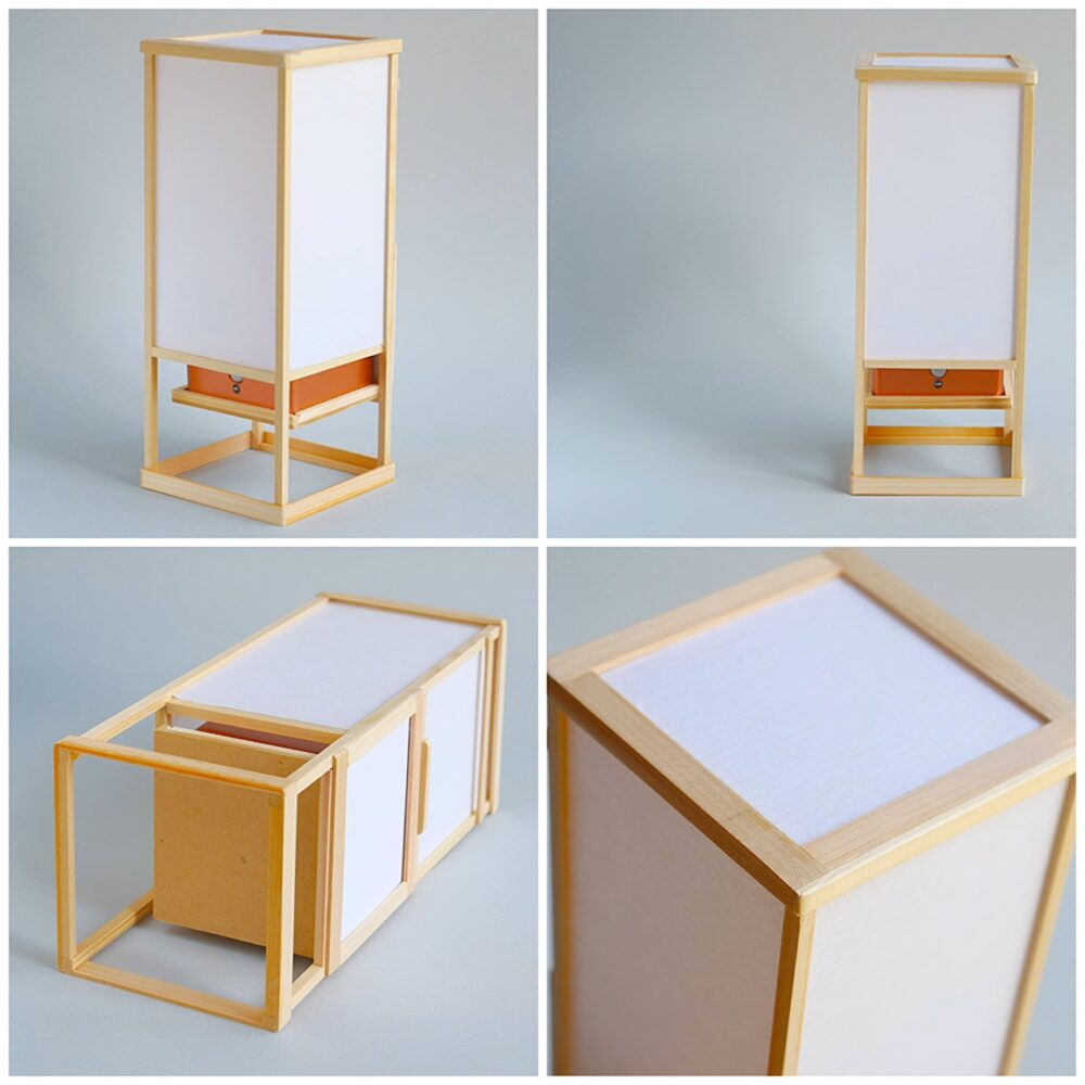 人感明暗センサーを搭載したハンドメイド作品。25cmの棚置用の灯り箱。